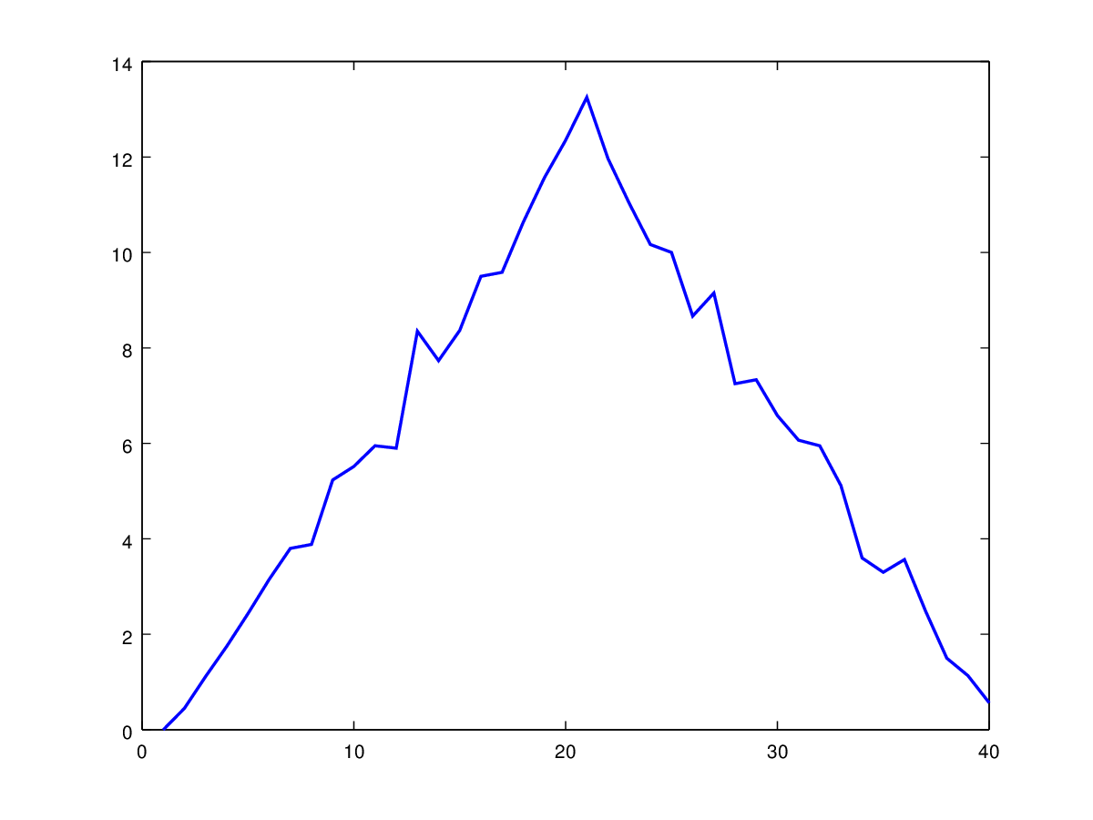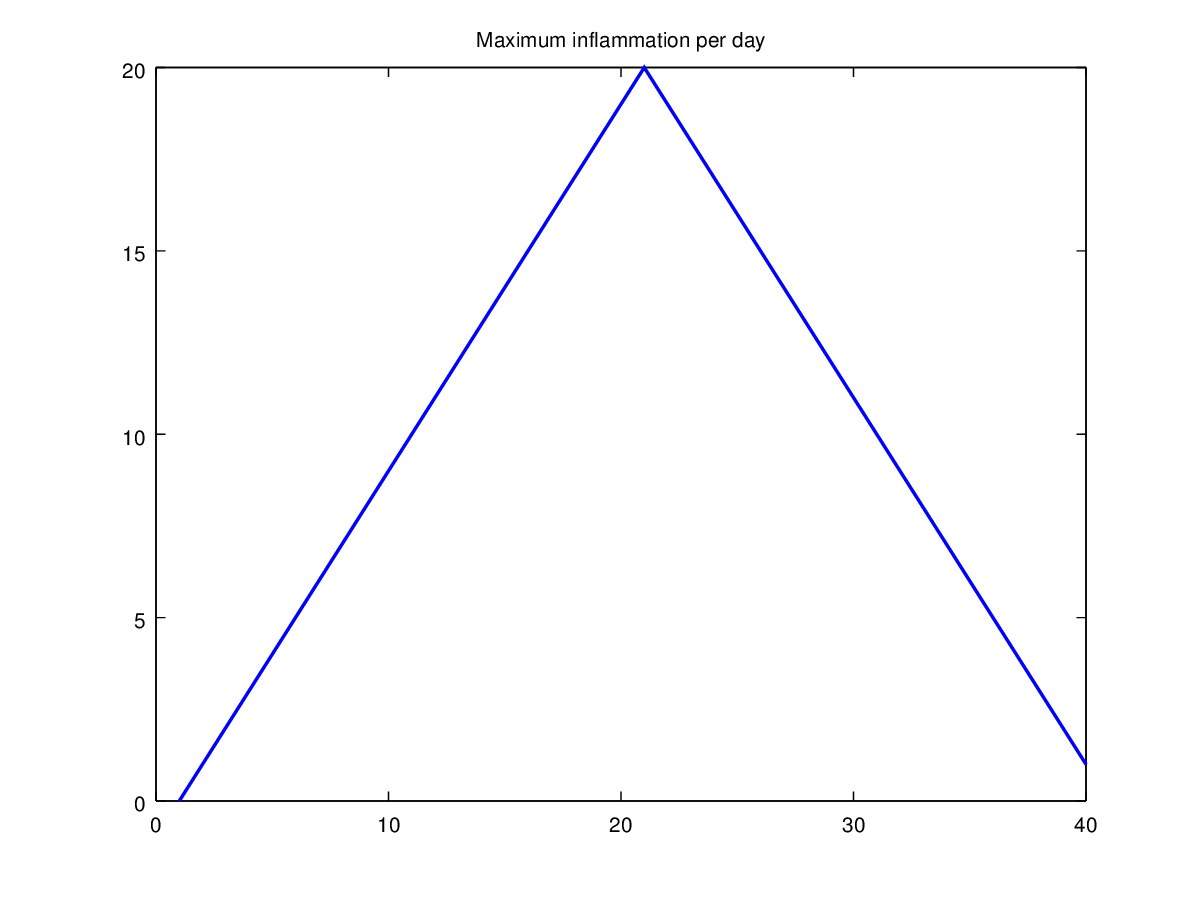 The imagesc function represents the matrix as a color image. Every value in the matrix is mapped to a color. Blue regions in this heat map are low values, while red shows high values. As we can see, inflammation rises and falls over a 40 day period. Let’s take a look at the average inflammation over time: